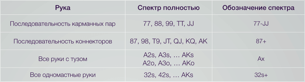 Определенный набор возможных стартовых рук игрока называется диапазоном, или ренджем (от англ. Range). Также его называют спектром.