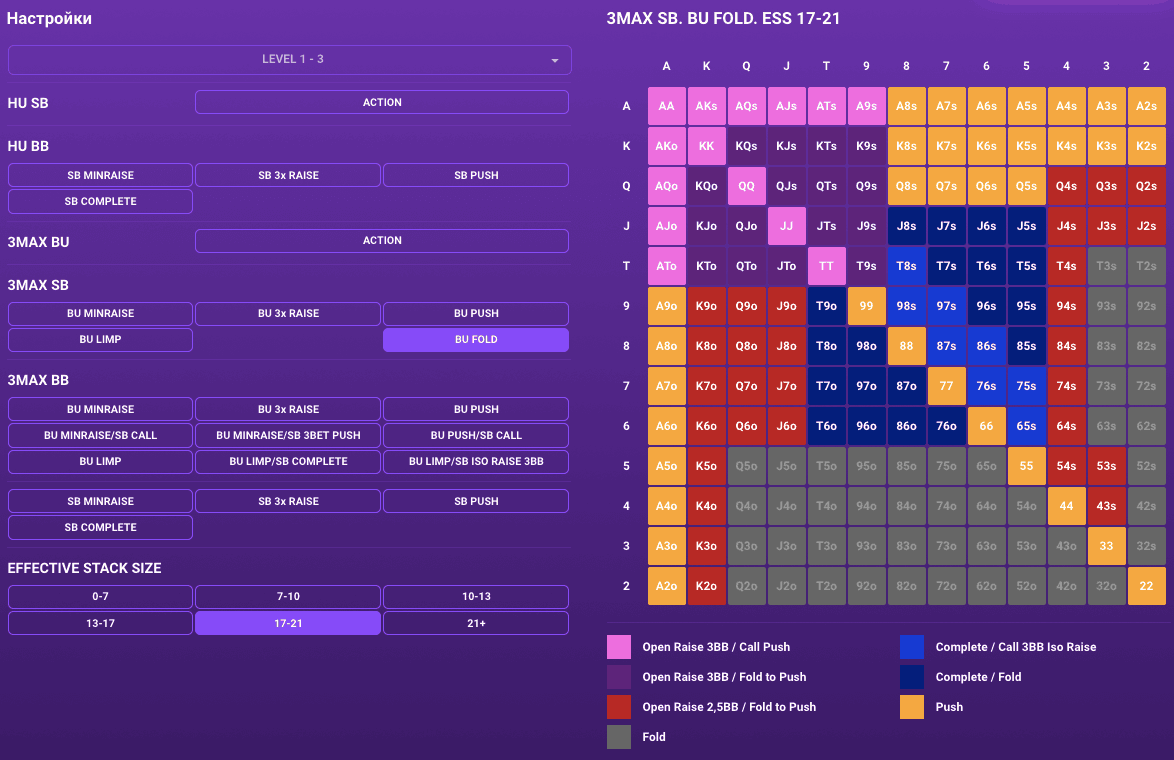 Стратегия разделена на различные позиции, глубину эффективных стэков, а также предшествующий экшн, с которым мы постоянно сталкиваемся в ходе игровых сессий.