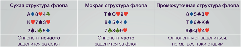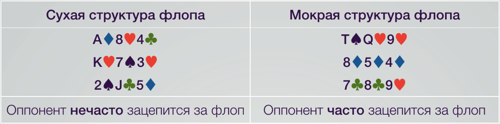 Сухие флопы, таким образом, хорошо подходят для простановки продолженных ставок на флопе.