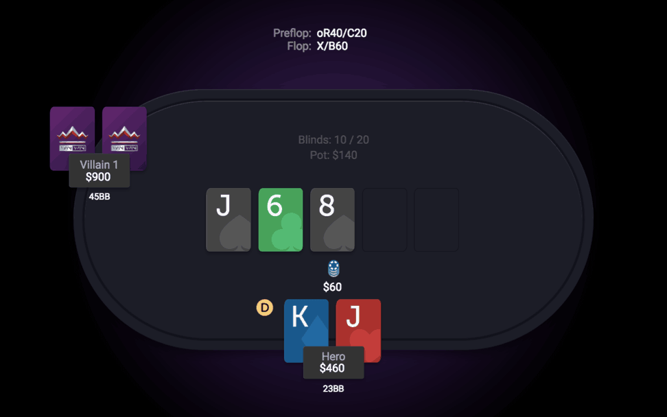 Вам всегда следует делать чек в подобных спотах и ждать какого-либо экшна от соперника: эта самая простая и прибыльная линия розыгрыша. Ваш соперник готов за вас выполнить задачу привлечения дополнительных фишек в банк.