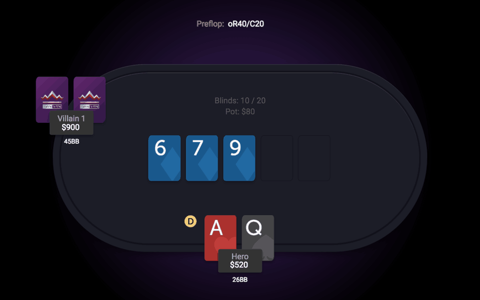 Наконец, в третьей раздаче мы зарейзили на префлопе AQ. Вышел флоп – 679 одной масти.