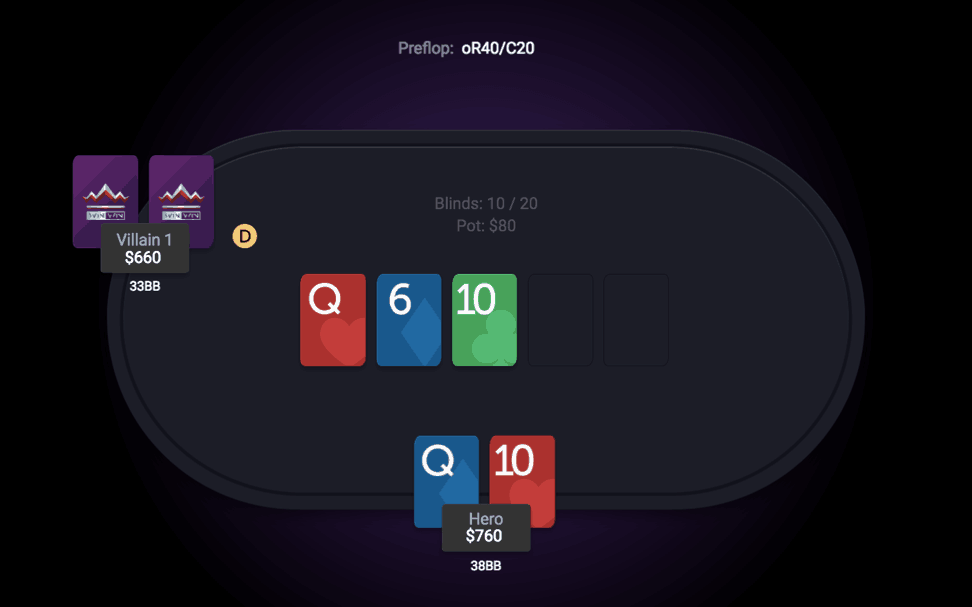 Например, мы заколлировали префлоп-рейз с QT. Так как мы в этой раздаче без позиции, нам приходится принимать решение первыми.